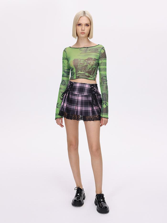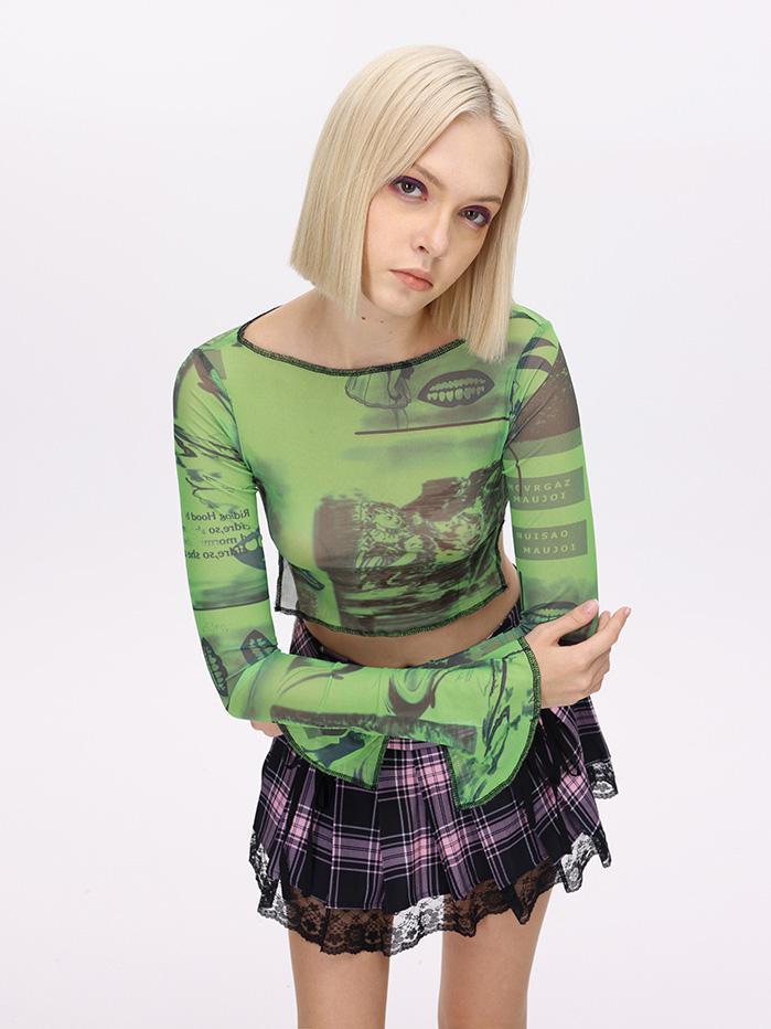 Abstract Figure Printed Slit Hem Top-Stitching Crop Tee